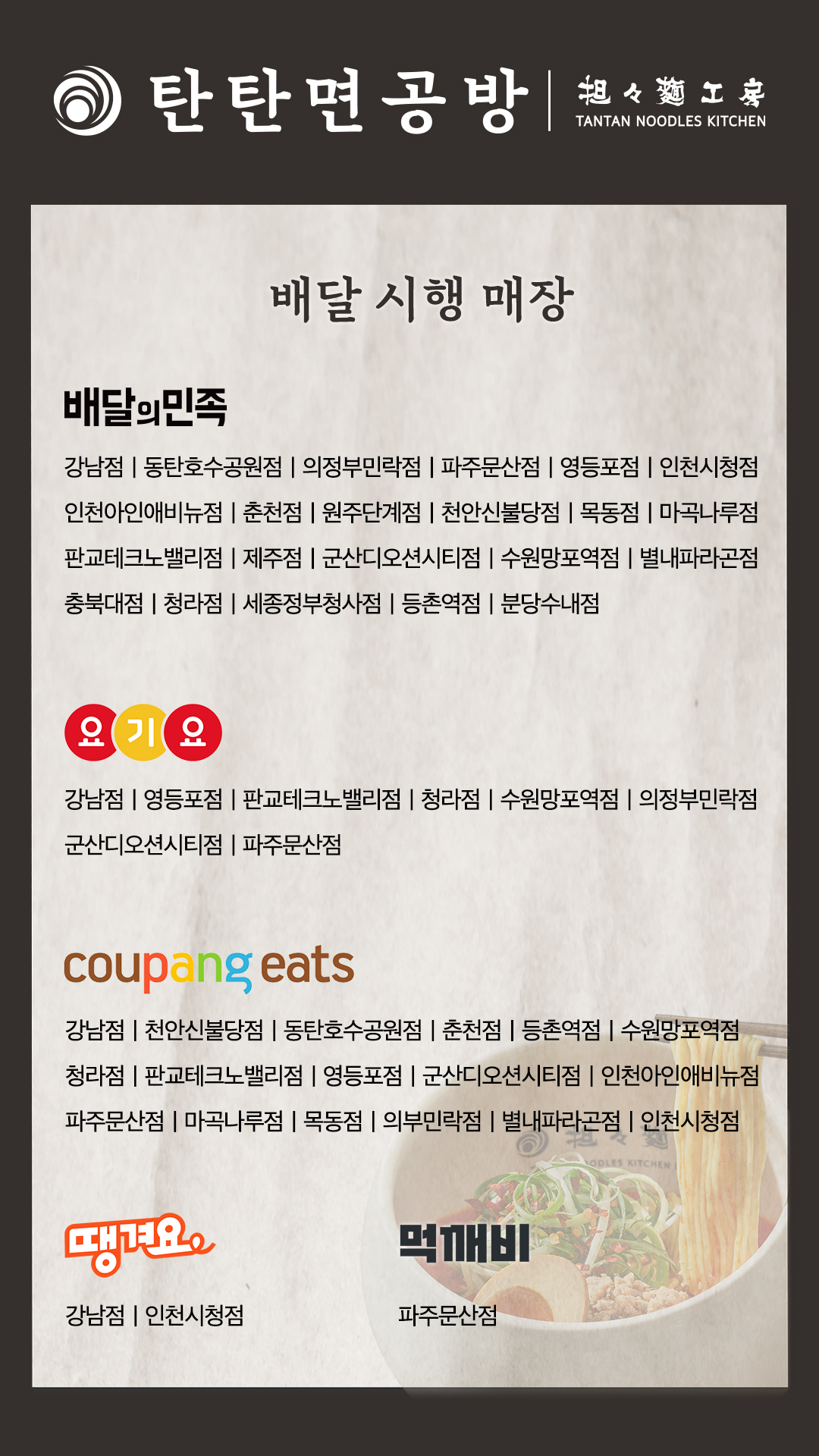 탄탄면공방 배달 매장 안내